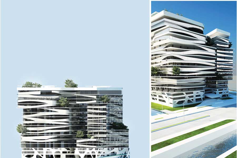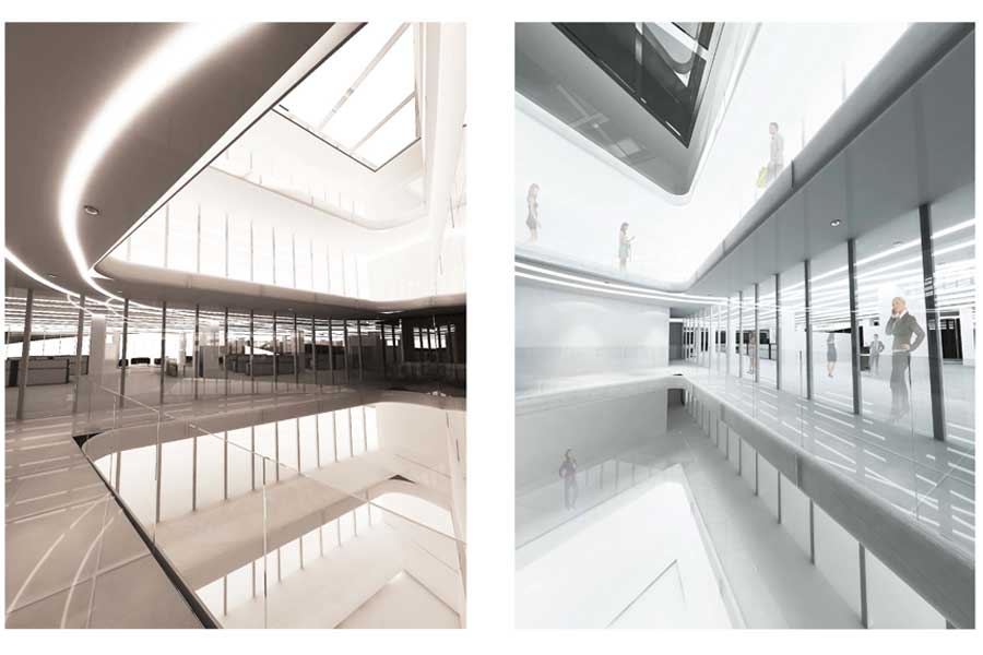 The glass film is designed parametrically to give a shading that is inconjunction with the facade to minimize the direct light on the interior area but still gives a fair amount of light during the day. On the daytime the wave glass film facade gives a direct light protection for the interior part. However, on night-time the glass facade gives an illumination effect to the surrounding area thus gives a dynamic facade morphology on the building.