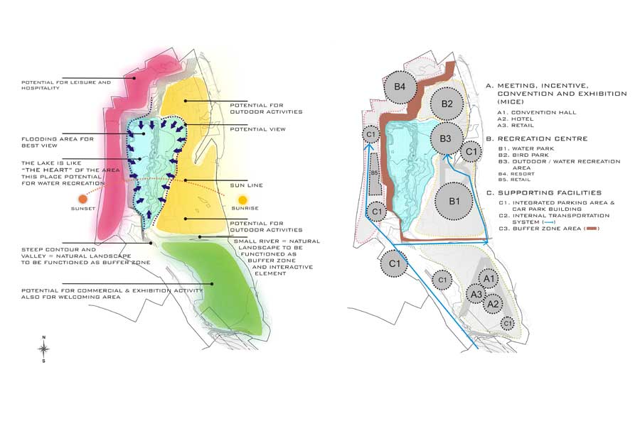 The inner ring to the lake is designed for frenzied activities and it can be used as buffer zone. In this area people are allowed to have a interaction with nature. However, the outer ring is designed for bustling activities such as for convention and meeting activites, or parking facilities.
