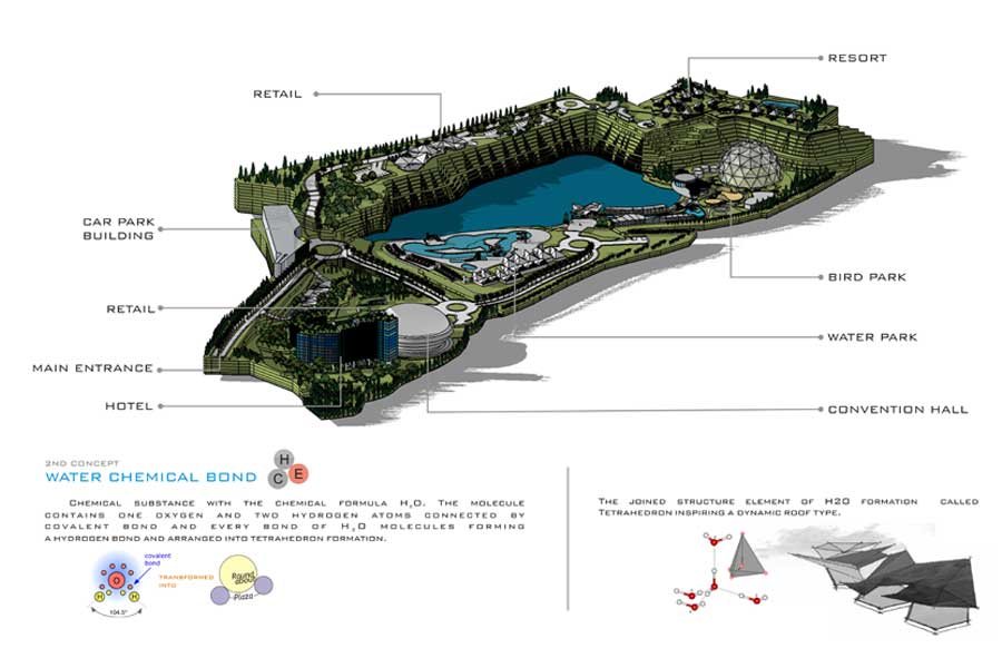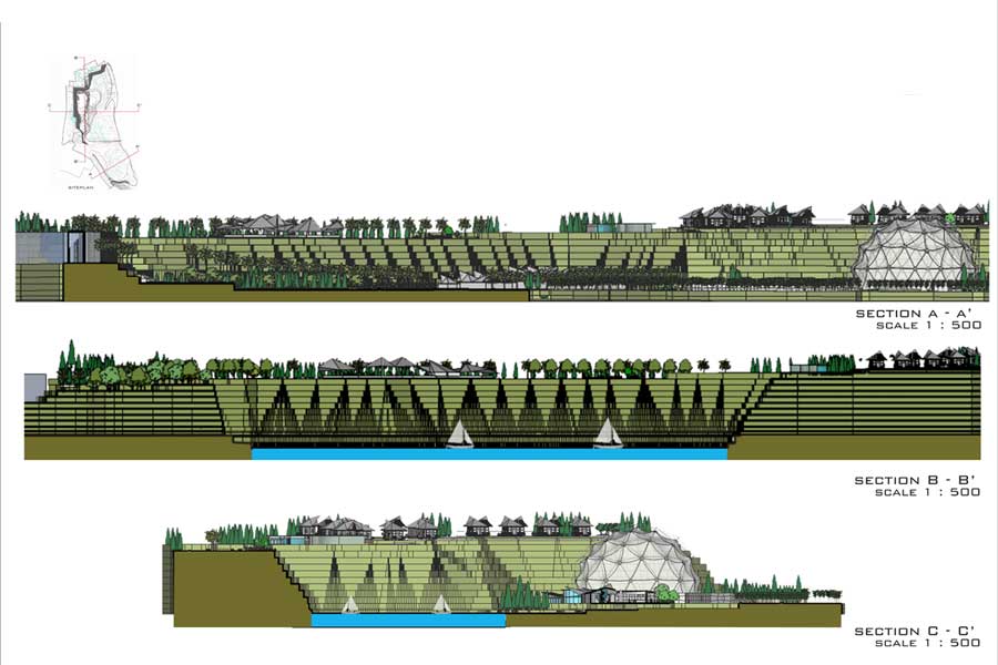 The objectives are creating mix-used development in the area that has beatuiful landscape and a pristine lake. Thus, the solutions are keeping the lake pristine, only few activities are allowed to minimize the waste result and by developing around lake by cut and fill strategy. Leaving the lake alone and pristine and creating calm atmosphere in the lake can be used for relaxation and escaped route from daily activites.