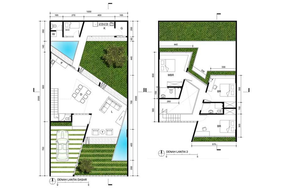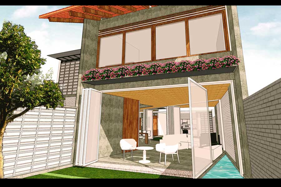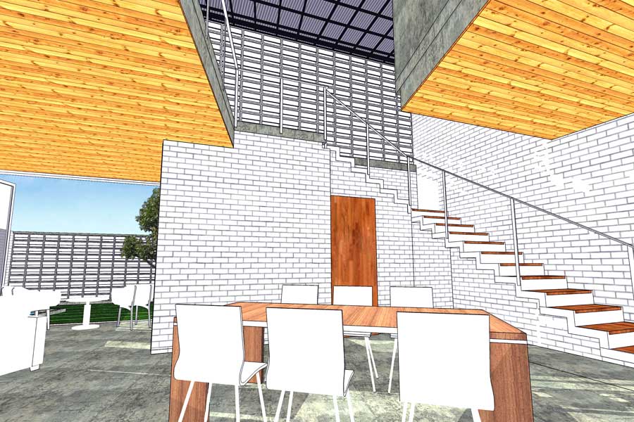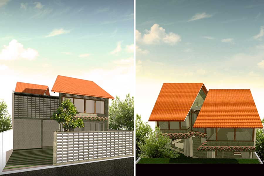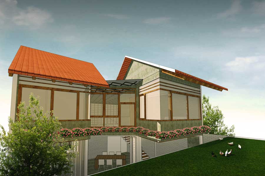 Ide dasar desain rumah ini adalah memaksimalkan prinsip-prinsip fisika dasar melalui penghawaan alami (cross ventilation) dan pencahayaan alami (natural lighting) serta meminimalisir eksploitasi luas lahan. Pada lantai dasar, ruang-ruang dalam dihubungkan langsung dengan ruang luar sehingga aliran udara bergerak menerus. Upaya pemaksimalan sirkulasi udara juga diterapkan dengan adanya void cerobong udara di tengah ruangan yang mengalirkan udara panas ke atas. Penanaman vegetasi pada ruang-ruang hijau baik di lantai dasar maupun lantai 2 diharap mampu membantu mengontrol suhu serta menjawab kebutuhan akan air tanah.